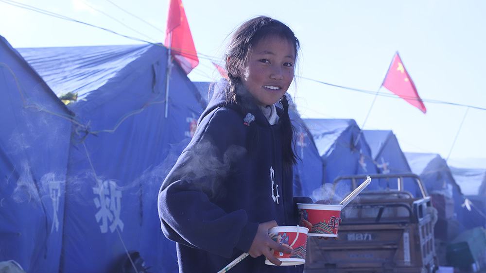長所鄉森嘎村安置點,一名女孩剛領完飯