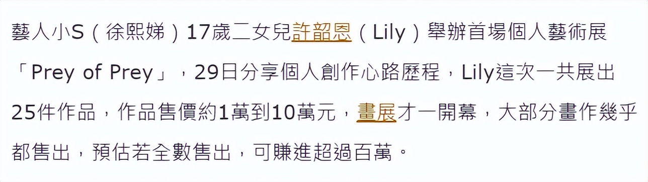 據臺媒爆料,17歲的Lily在6月29日舉辦個人畫展,展出了25幅畫作,現場人員爆料,畫作幾乎被搶購一空,大部分都賣掉了,售價在1萬到10萬臺幣。