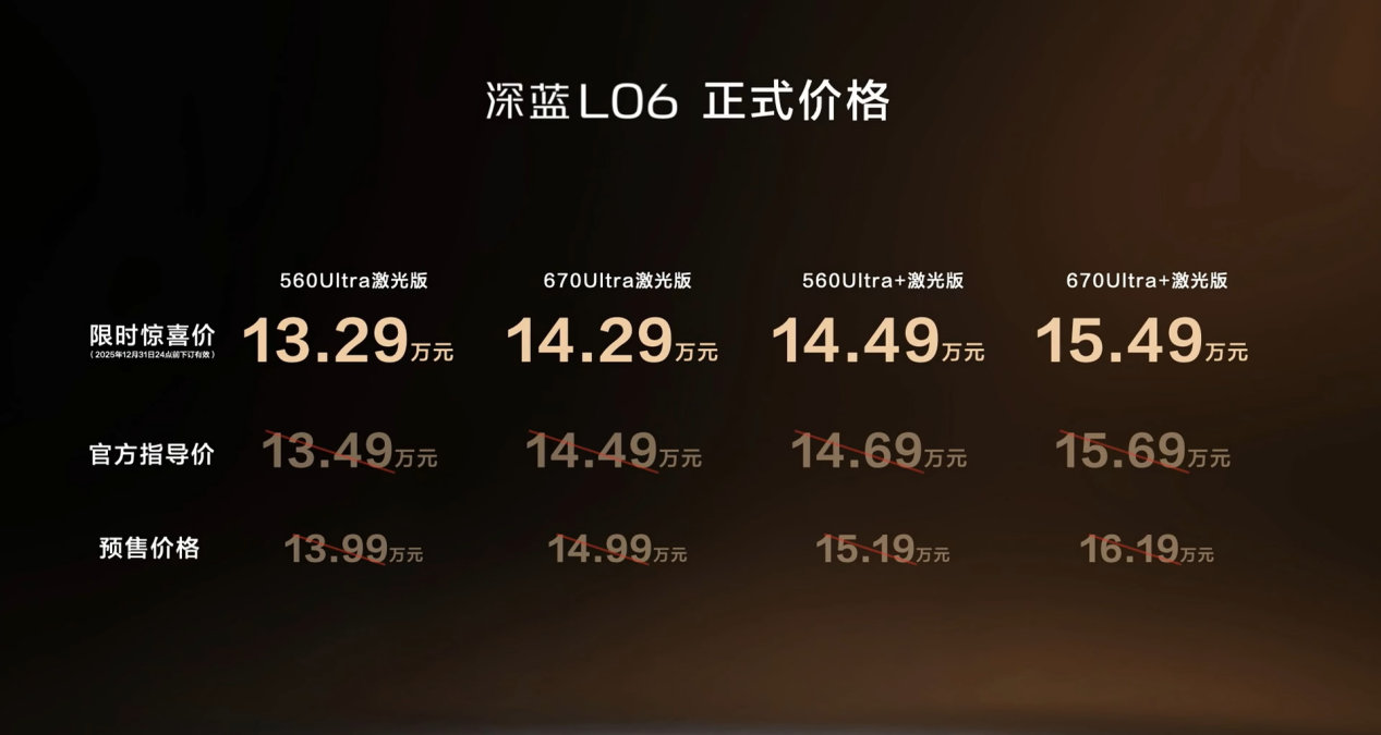 11月18日,正式上市,共推出4款車型,官方指導價13.49-15.69萬元,限時驚喜價13.29-15.49萬元。同時官方還推出了至高價值78760元的購車權益,此外2025年11月30日前鎖單,非客戶原因導致跨年交付的,購置稅差額由深藍汽車承擔。