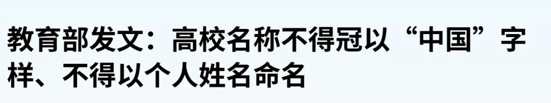 根據(jù)教育部規(guī)定,高校命名,原則上不得冠以“中華”“中國(guó)”“國(guó)家”“國(guó)際”等代表中國(guó)及世界的慣用字樣,也不得冠以“華北”“華東”“東北”“西南”等大區(qū)及大區(qū)變體字樣。