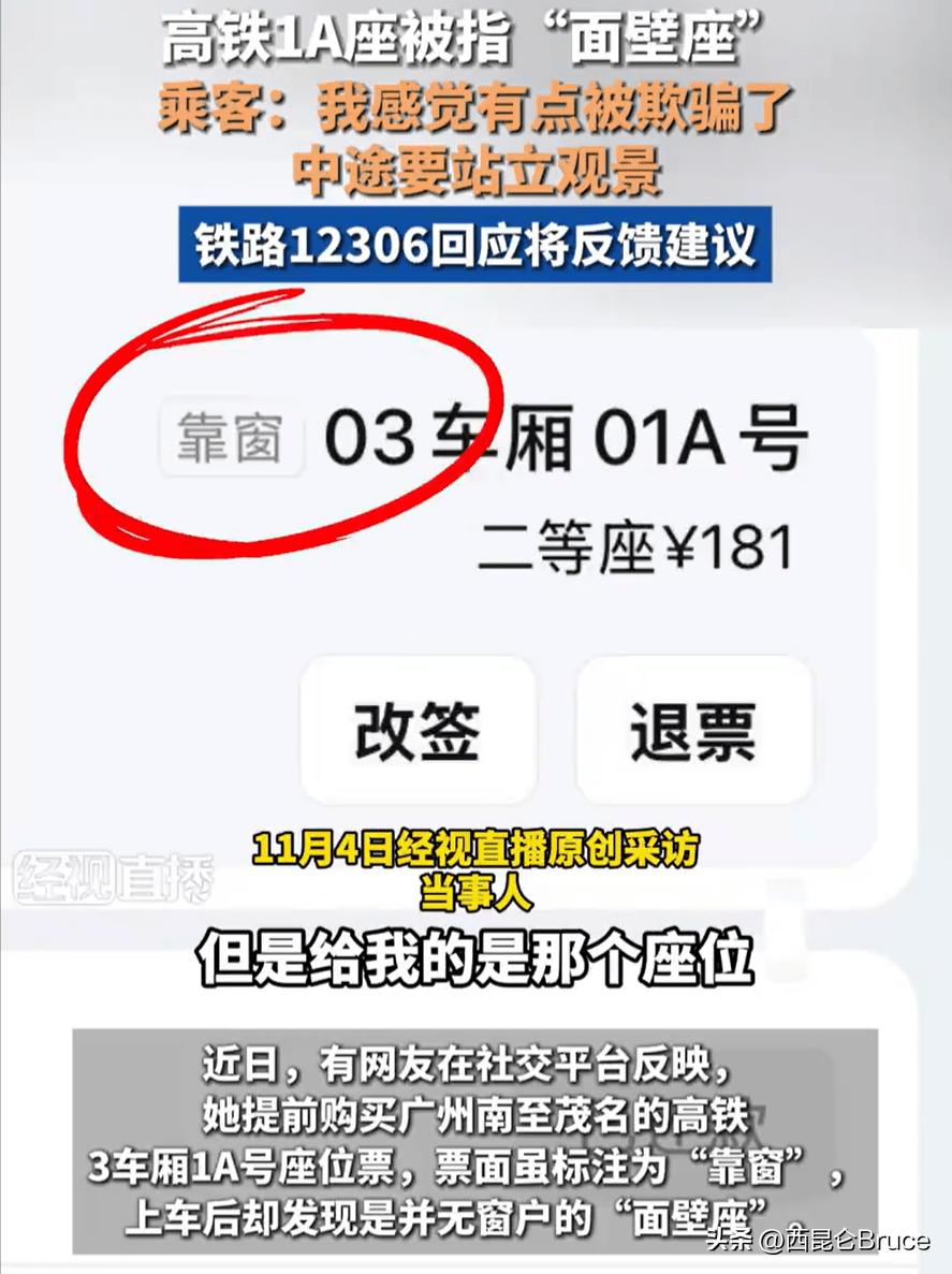 “說好的靠窗呢?”不久前,一位網友提前購買廣州南至茂名的高鐵票,票面標注“靠窗”的3車廂1A號座位,上車后卻發現是“面壁座”,因觀景體驗不佳,不得不中途站立乘車。