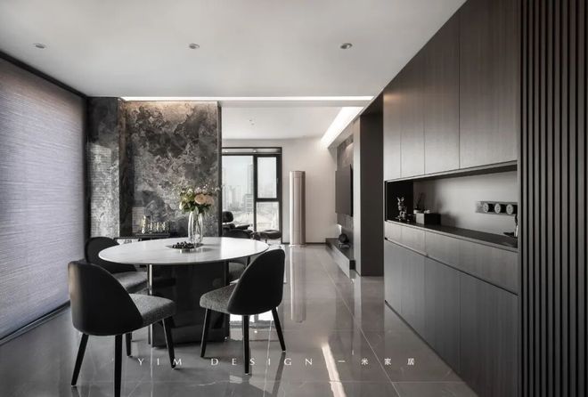 無主燈的家也給了巖板石材背景出彩的機會,干脆利落地骨骼處理讓家更顯沉穩(wěn)大氣。原本的客餐廳是長條型,改造后重新劃分吊頂?shù)谋壤蛷d頂部是筆直挺闊的線,餐廳則連接了弧形設(shè)計,化解橫豎梁的陋處。