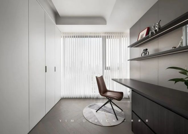 開放式的書房配上落地窗,和煦的陽光灑進來使整個空間開朗明亮。