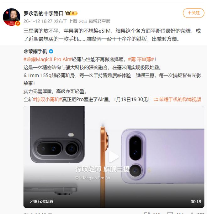 羅永浩點評超輕薄手機,三星、蘋果成背景,榮耀勝出
