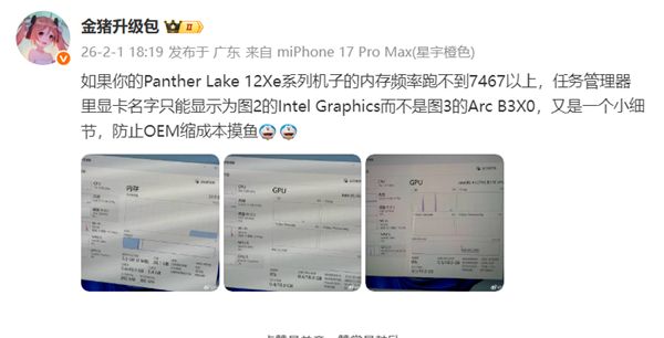 具體而言,即便處理器硬件上搭載了基于Xe3架構的銳炫B390或銳炫B370核顯,但如果廠商搭配的內存頻率低于7467MT/s,Windows任務管理器將不會顯示具體型號,而是直接降級顯示為泛指的"Intel Graphics"。