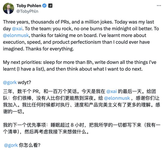 幾乎同一時間,Grok團隊的另一位核心研究員Toby Pohlen也宣布離職。
