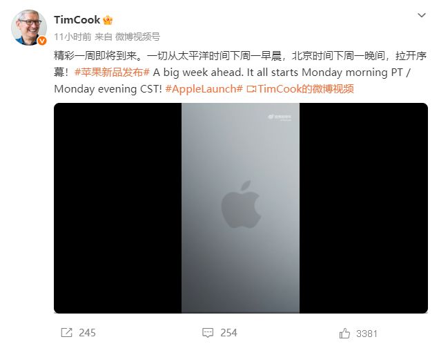蘋果公司CEO庫克在微博發文稱:精彩一周即將到來。一切從太平洋時間下周一早晨,北京時間下周一晚間,拉開序幕!